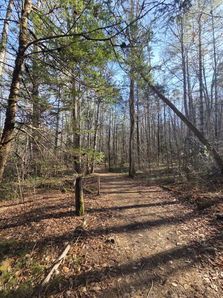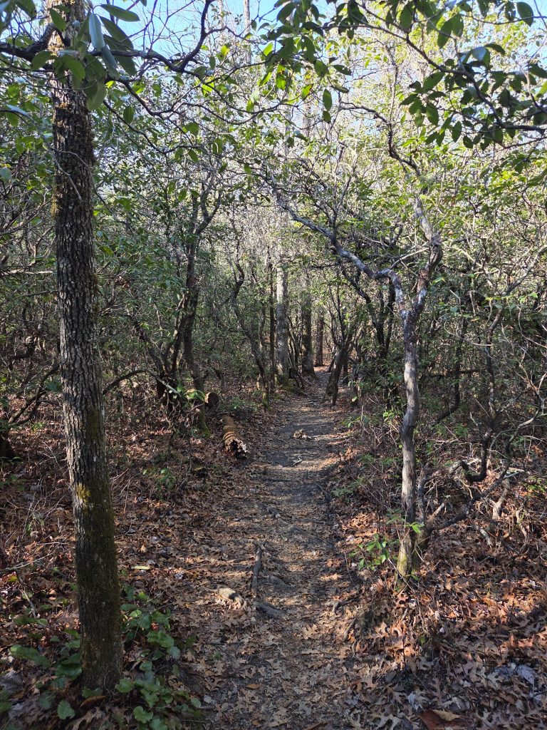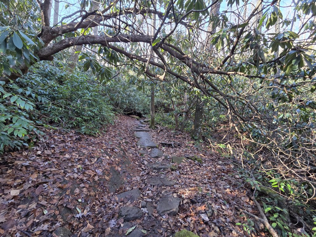 I am by no means studied on tree species, but some quick searching against the image suggests these may be thickets of Mountain Laurel. So, when it is this time of year, they make for a very spooky tunnel. I would be creeped out if I was hiking this bit at night – this is some Ichabod stuff. Very cool though.
