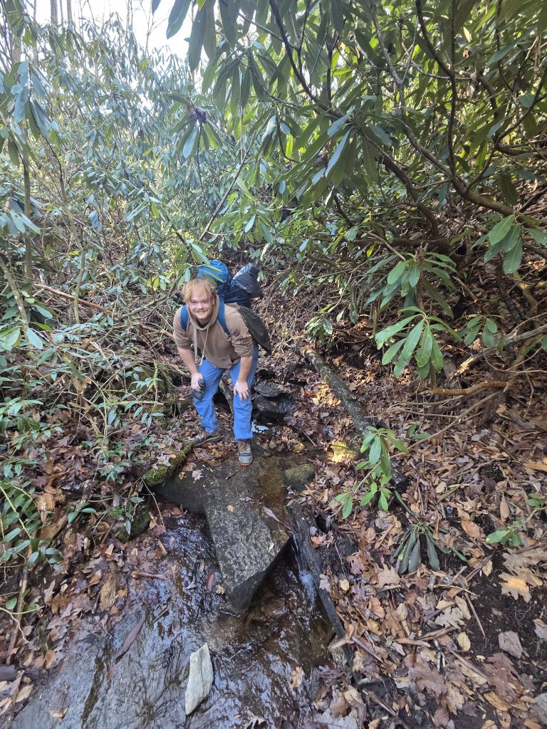 After our brief water break here, we continued on and it was smooth sailing. The trail here stays relatively flat and in the woods along the creek. At this point, we found there were many large, prepared campsites ideal for hosting many people. We even spotted a solo camper set up, fire going!