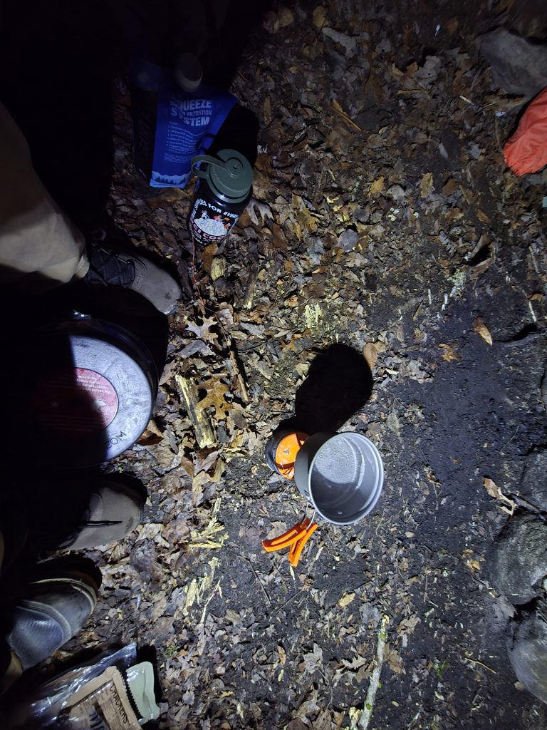 I helped set up our tents and inflate bedding and such, and began getting water going for meals and hot chocolate. We attempted a fire, of which I got something going for a little bit with starter and some kindle, but we had no actual logs for fuel. Thus, we had to switch to my small frying pan to cook up our sausages.