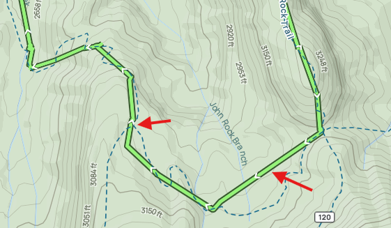 We had stopped for a pee break when the coast was clear and then continued a little bit before I had realized we were supposed to go onto John Trail at an intersection – nothing wrong with a little extra calories burned however. Correcting our mistake, we turned onto John Trail where it intersected with Cat Gap and begin going onward and upward some more.